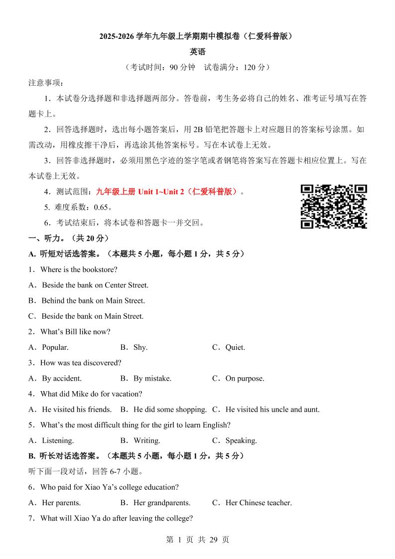【仁爱】期中模拟卷02【范围:U1-U2】
