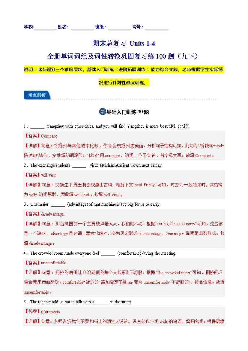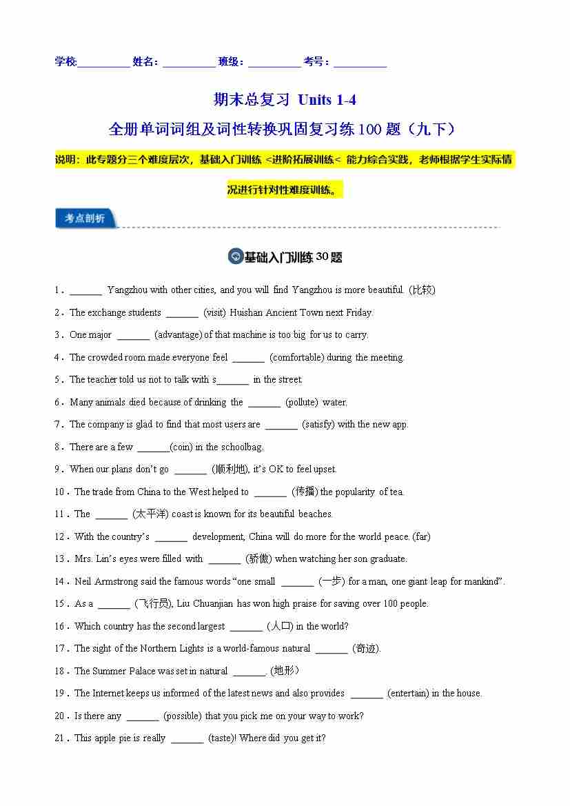 期末总复习 Units 1-4 全册单词词组及词性转换巩固复习练100题(九下)(解析版)