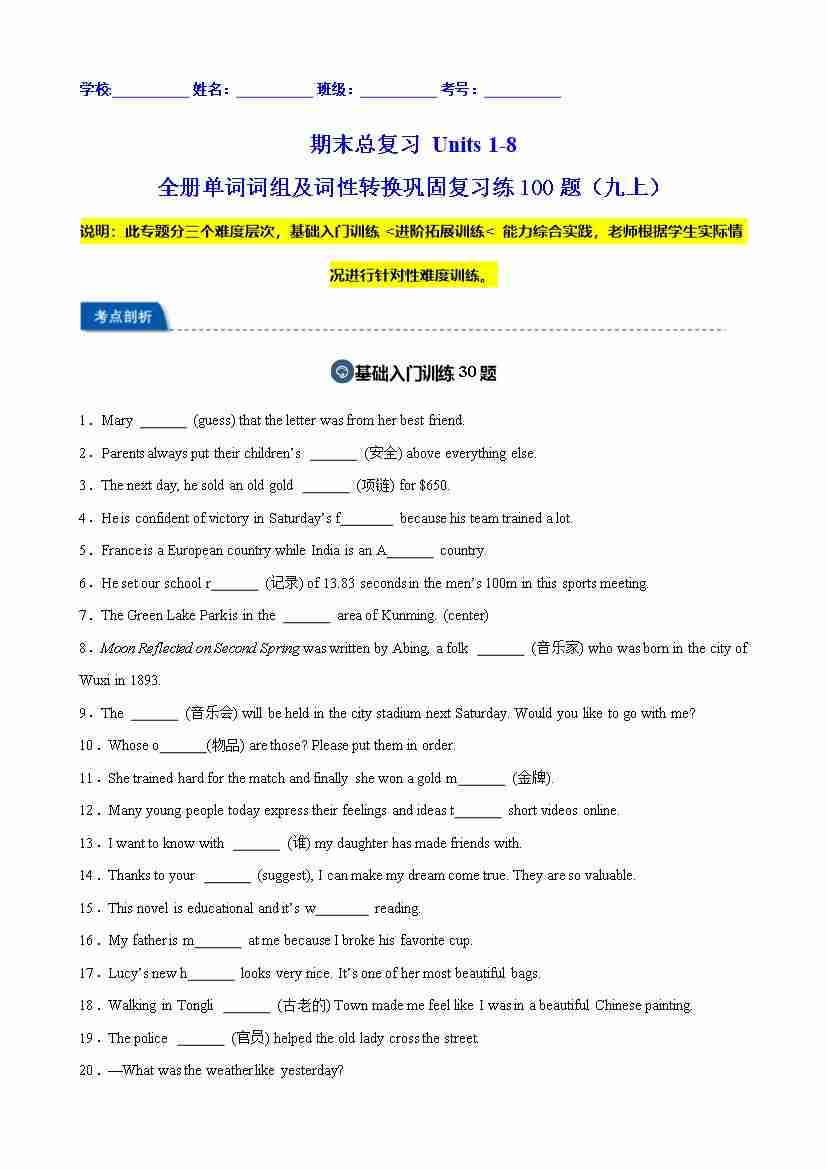 期末总复习 Units 1-8 全册单词词组及词性转换巩固复习练100题(九上)(原卷版)