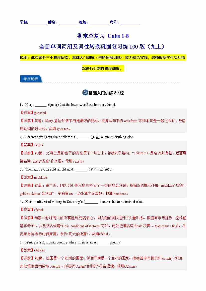 期末总复习 Units 1-8 全册单词词组及词性转换巩固复习练100题(九上)(解析版)