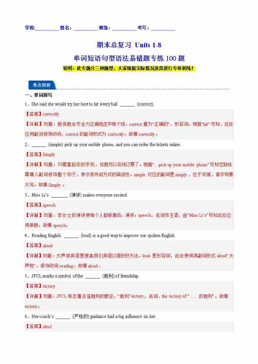 期末总复习 Units 1-8 单词短语句型语法易错题专练100题(解析版)