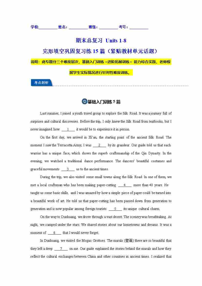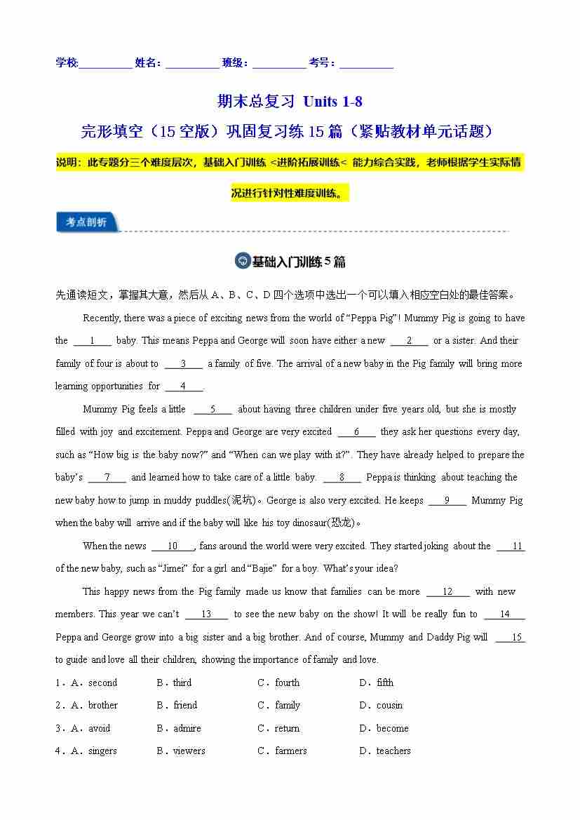 期末总复习 Units 1-8 完形填空(15空版)巩固复习练15篇(紧贴教材单元话题)(原卷版)