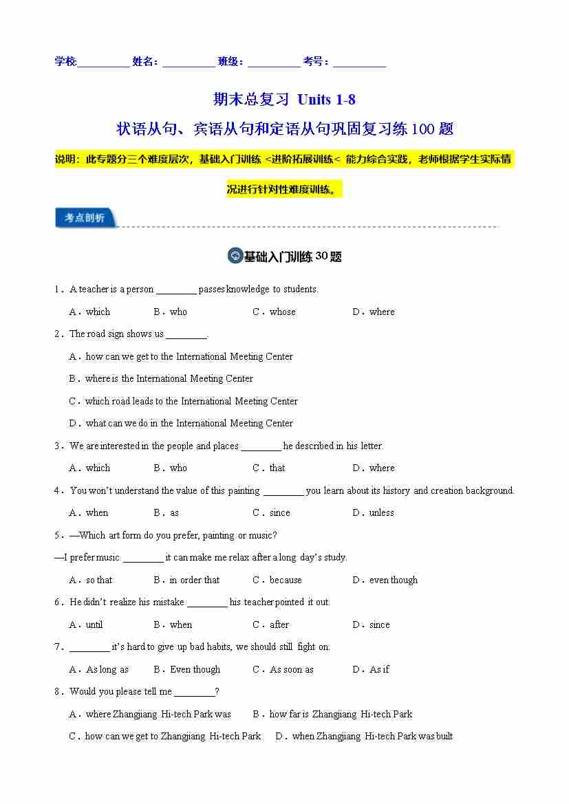 期末总复习 Units 1-8 状语从句、宾语从句和定语从句巩固复习练100题(原卷版)