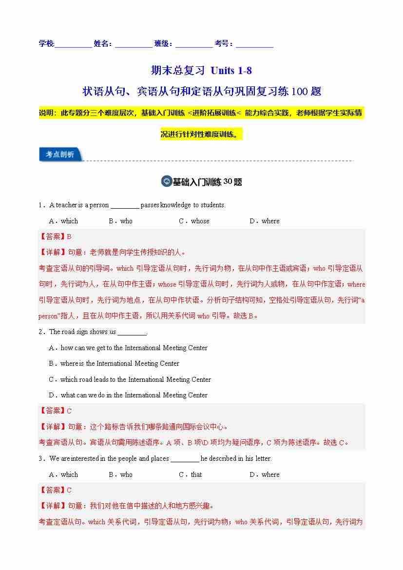 期末总复习 Units 1-8 状语从句、宾语从句和定语从句巩固复习练100题(解析版)