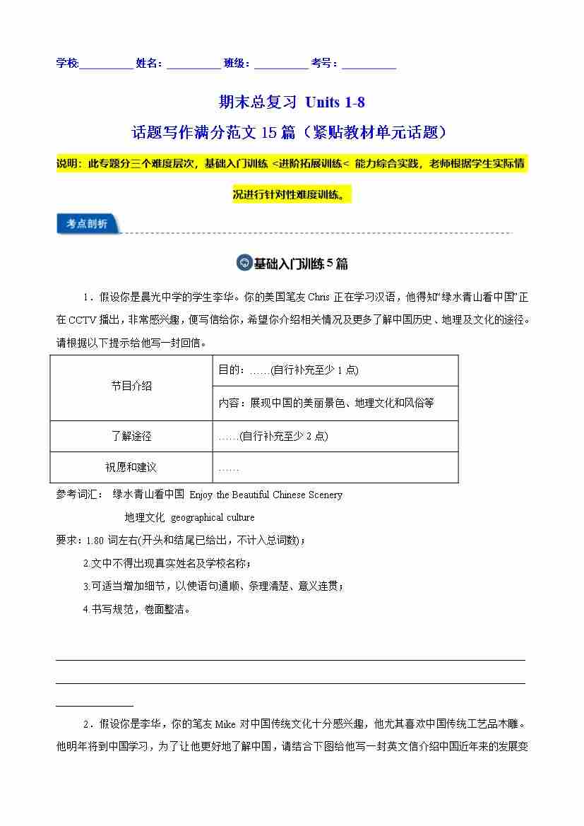 期末总复习 Units 1-8 话题写作满分范文15篇(紧贴教材单元话题)(原卷版)