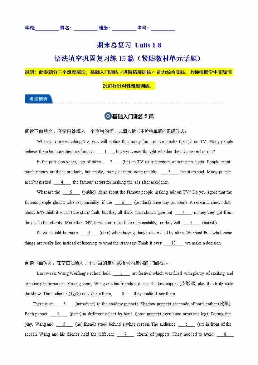 期末总复习 Units 1-8 语法填空巩固复习练15篇(紧贴教材单元话题)(原卷版)