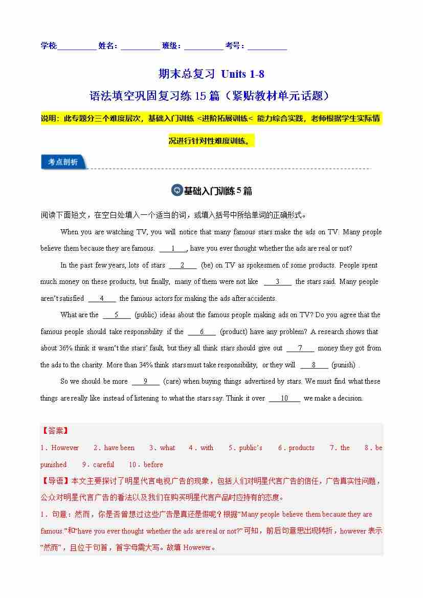 期末总复习 Units 1-8 语法填空巩固复习练15篇(紧贴教材单元话题)(解析版)