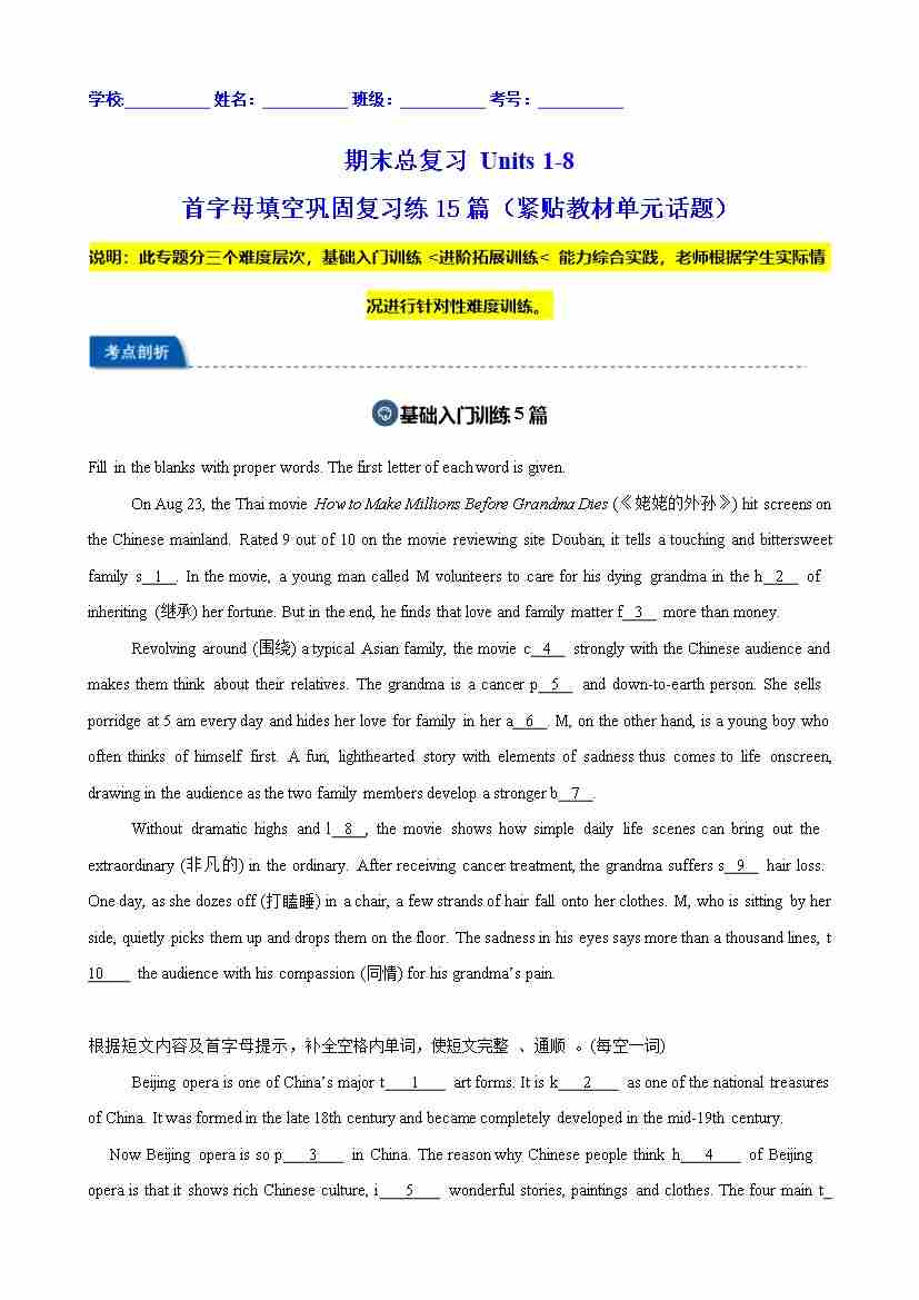 期末总复习 Units 1-8 首字母填空巩固复习练15篇(紧贴教材单元话题)(原卷版)