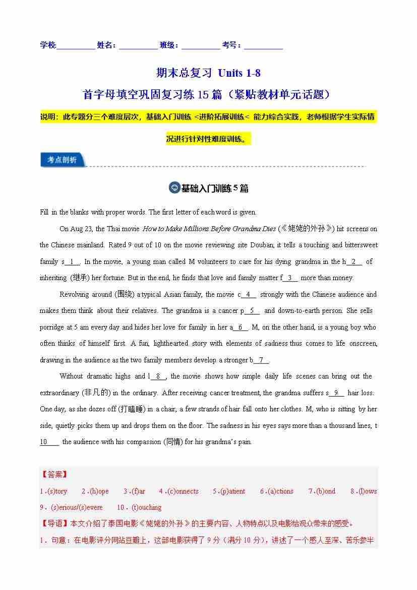 期末总复习 Units 1-8 首字母填空巩固复习练15篇(紧贴教材单元话题)(解析版)