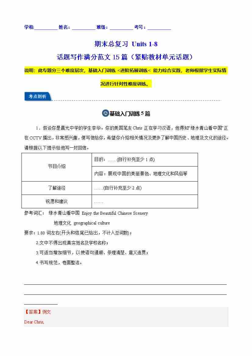期末总复习 Units 1-8 话题写作满分范文15篇(紧贴教材单元话题)(解析版)