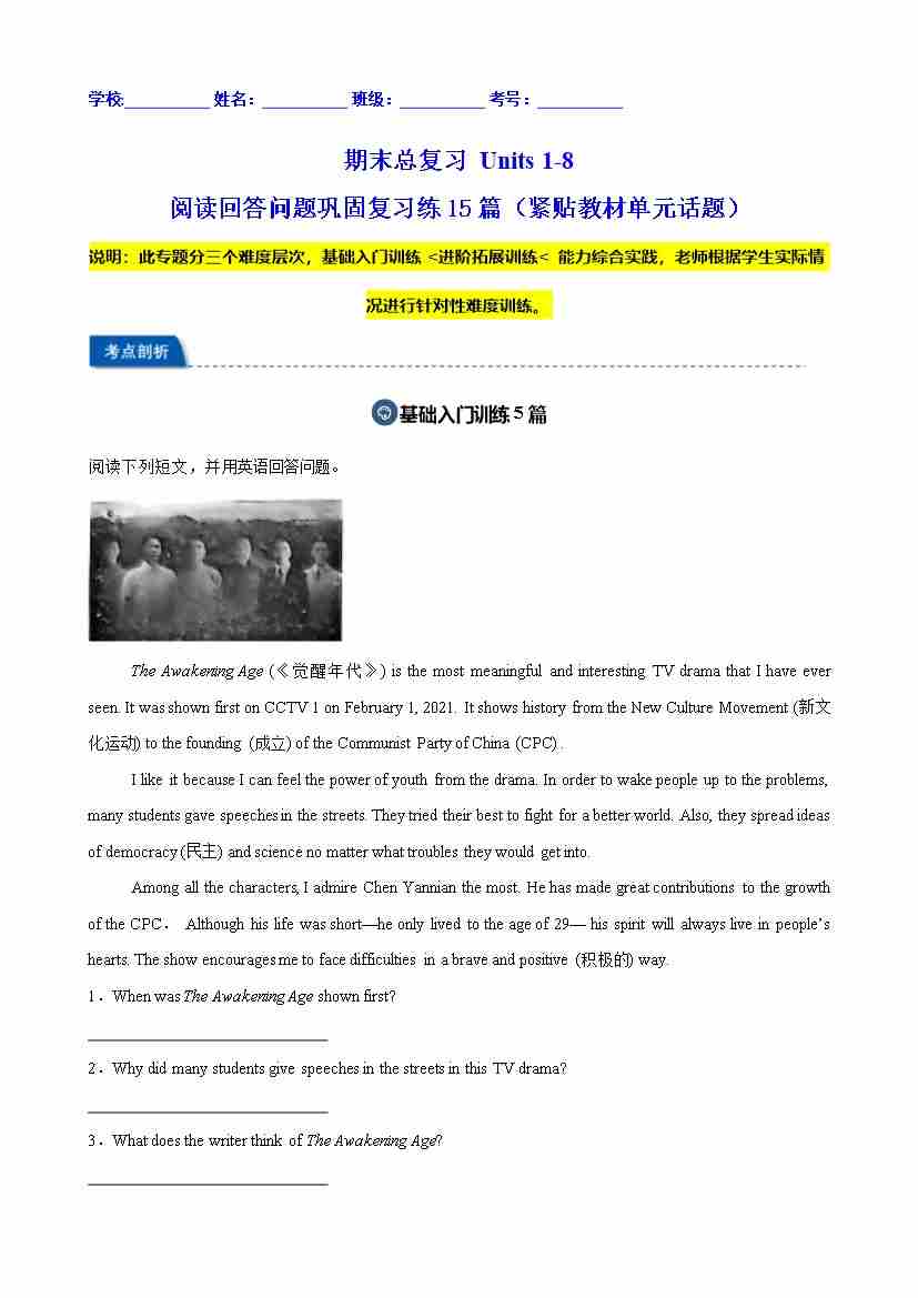 期末总复习 Units 1-8 阅读回答问题巩固复习练15篇(紧贴教材单元话题)(解析版)