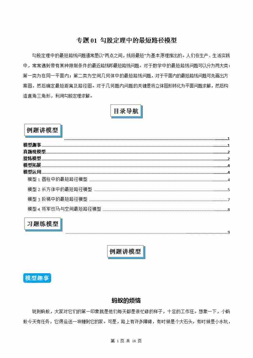 专题01 勾股定理中的的最短路径模型(几何模型讲义)北师版2024(原卷版)