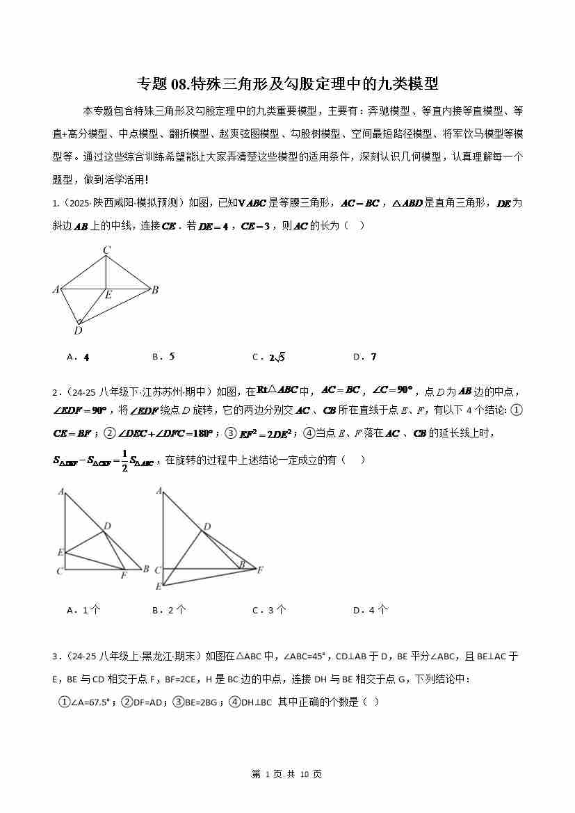 专题08 特殊三角形及勾股定理中的九类模型(几何模型讲义)北师版2024(原卷版)