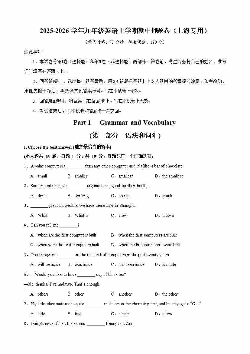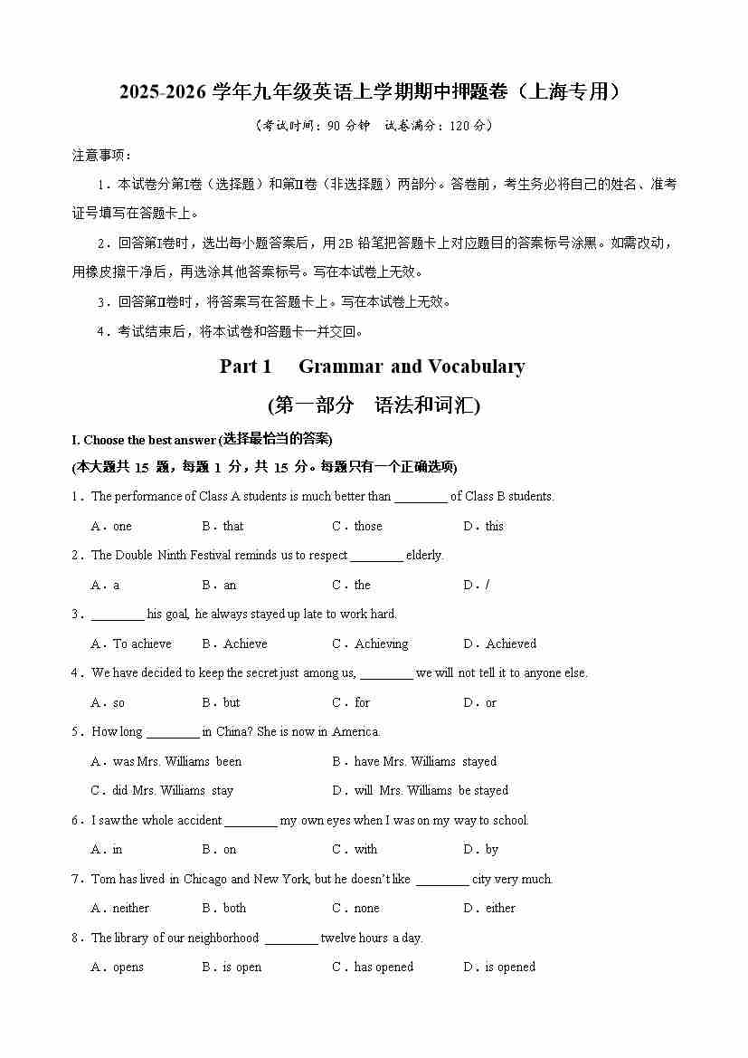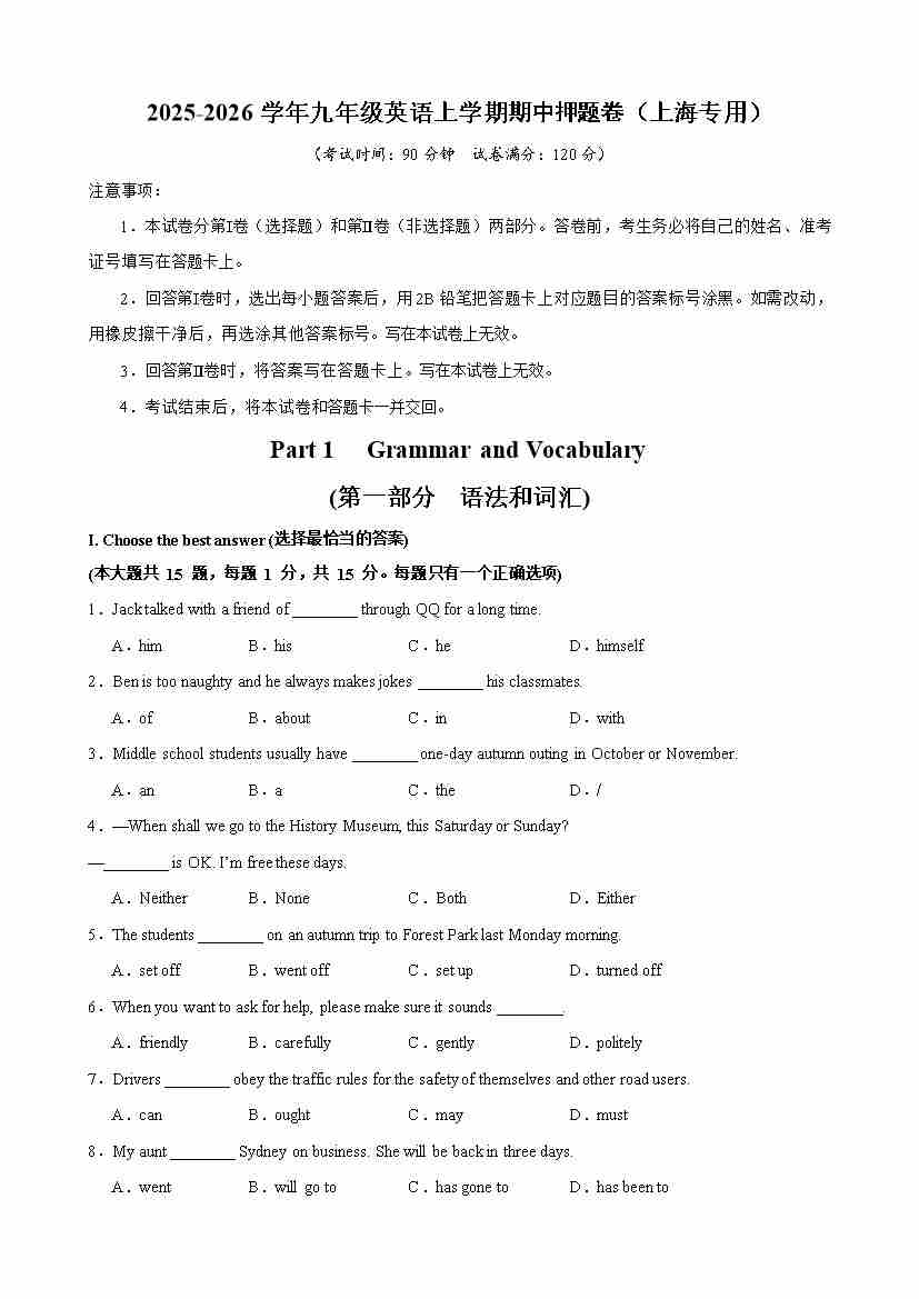 九年级英语上学期期中押题预测卷(上海专用)(学生版)
