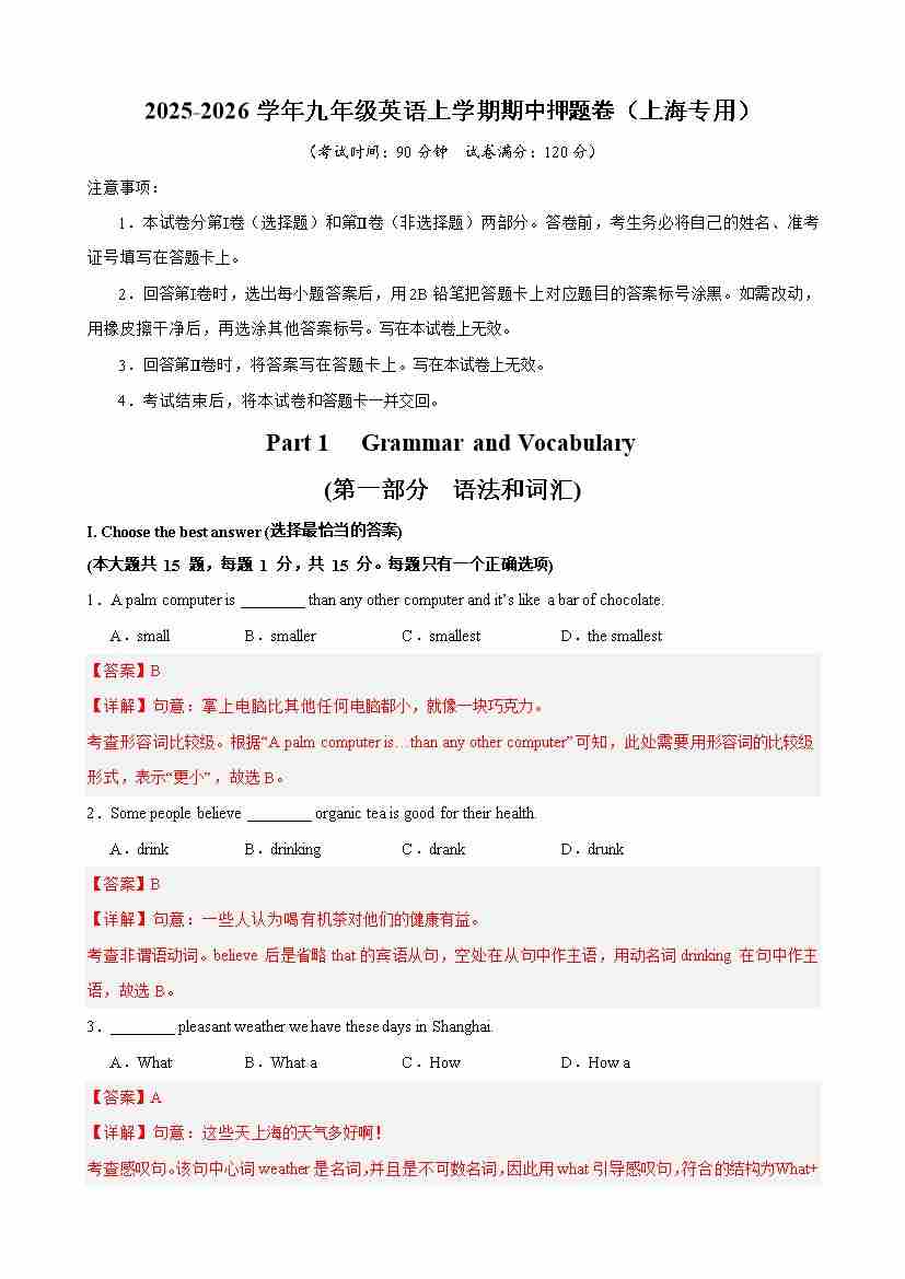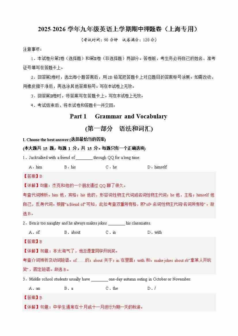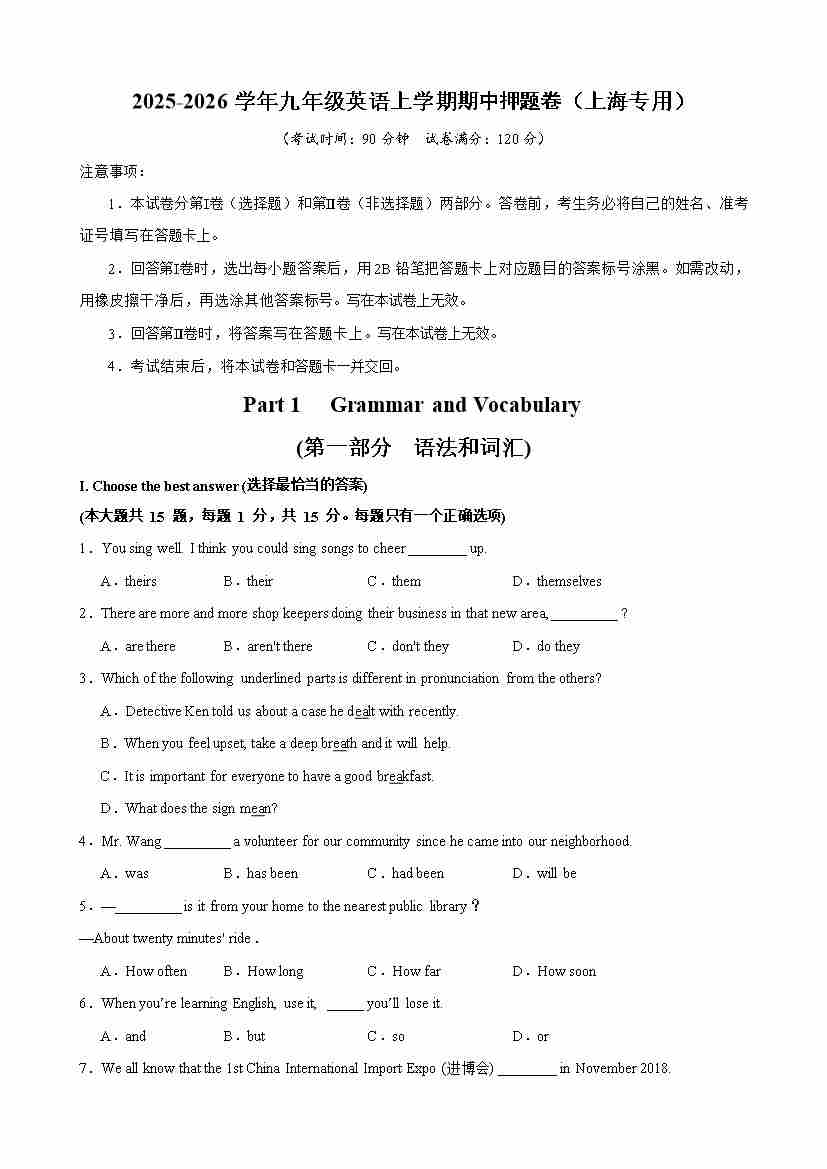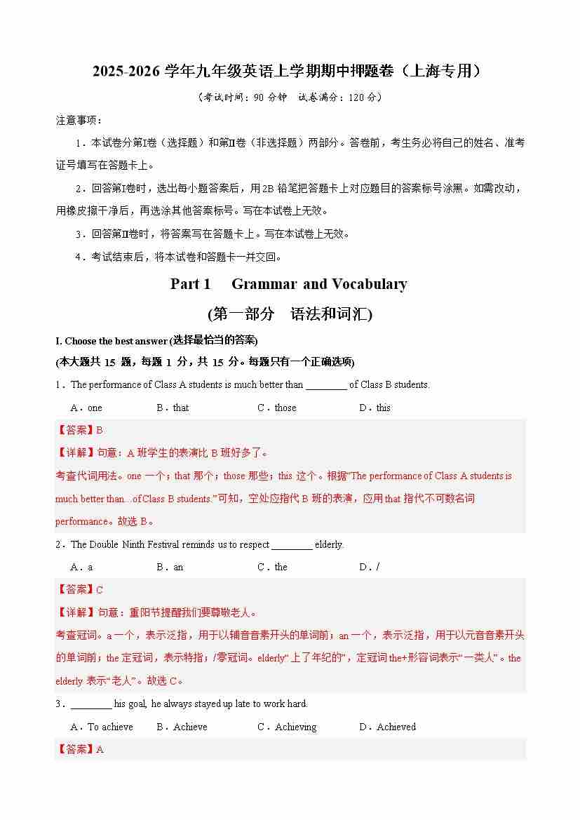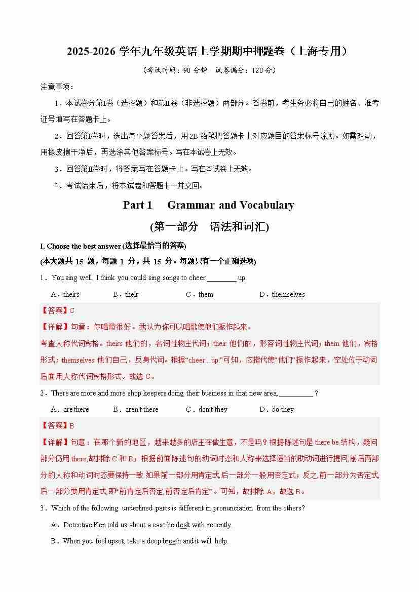 九年级英语上学期期中押题预测卷(上海专用)(教师版)