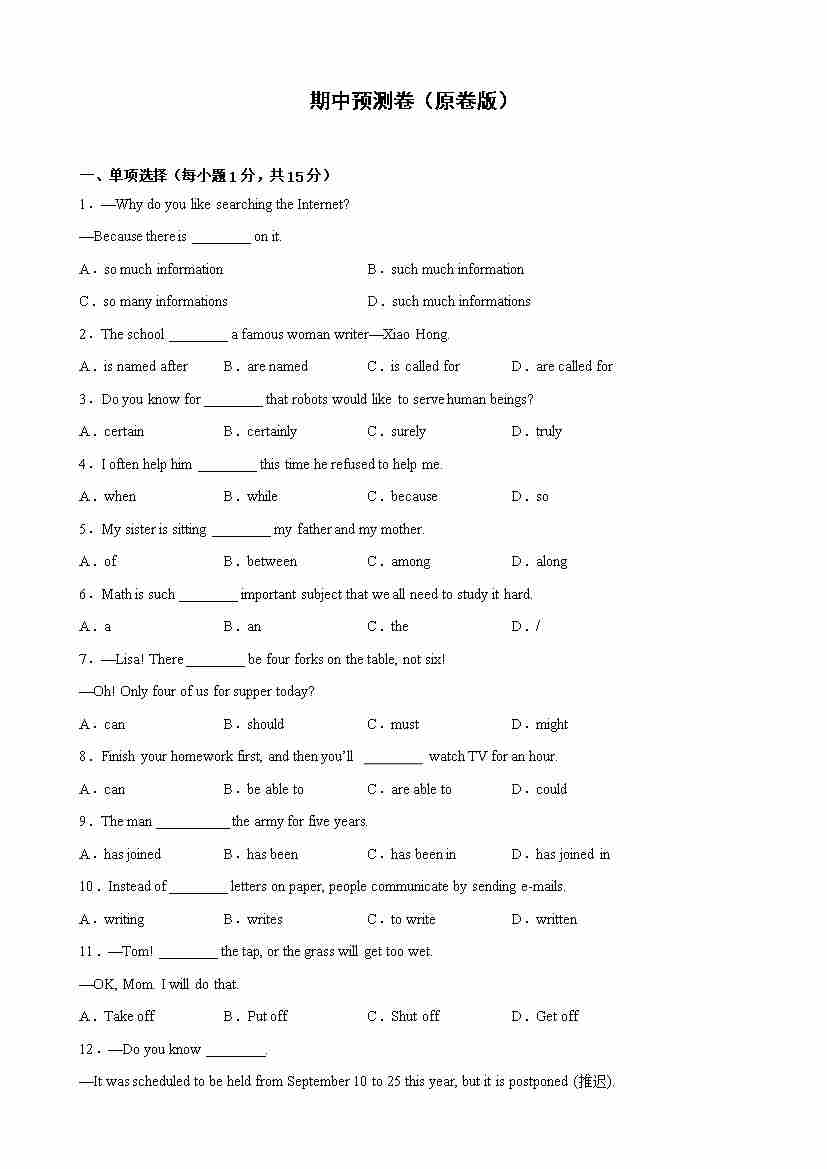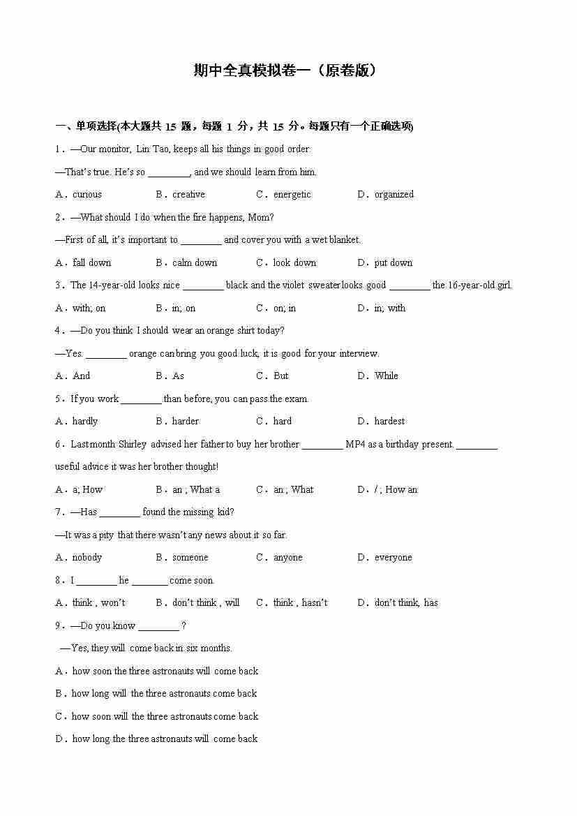 期中全真模拟卷一(原卷版)-九年级上册(牛津上海版)