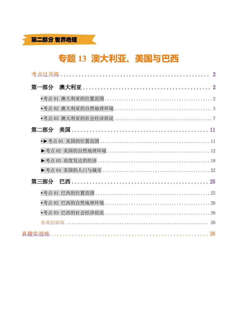 专题13 澳大利亚、美国与巴西(练习)(原卷版)