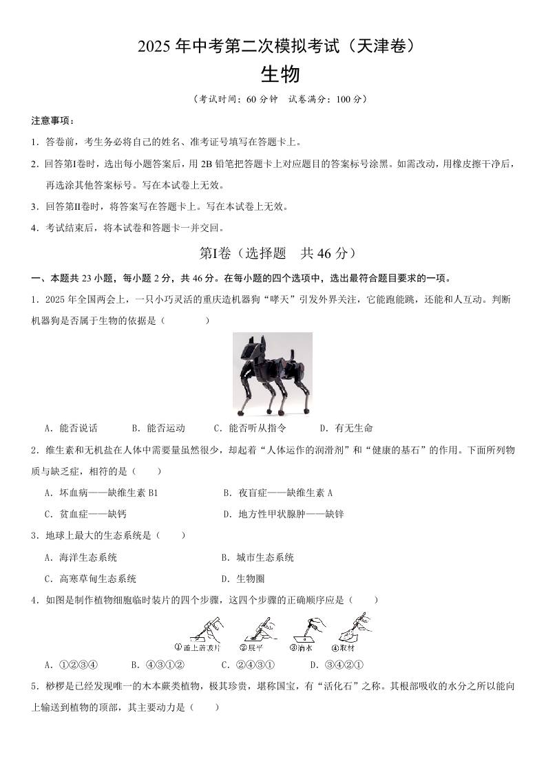 2025年中考第二次模拟生物(天津卷)(考试版A4)