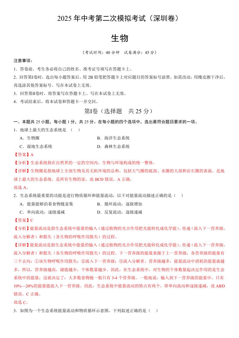 2025年中考第二次模拟生物(深圳卷)(全解全析)