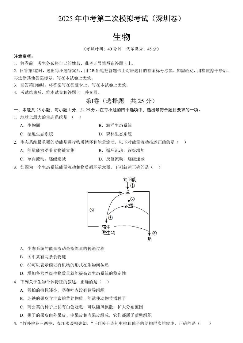 2025年中考第二次模拟生物(深圳卷)(考试版A4)