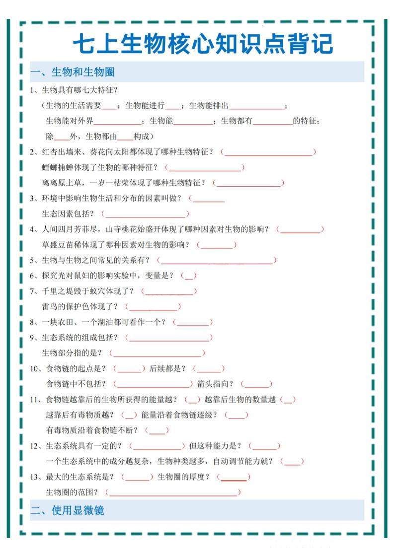 2025年中考生物一轮复习:七上生物核心考点背记提纲(默写)_