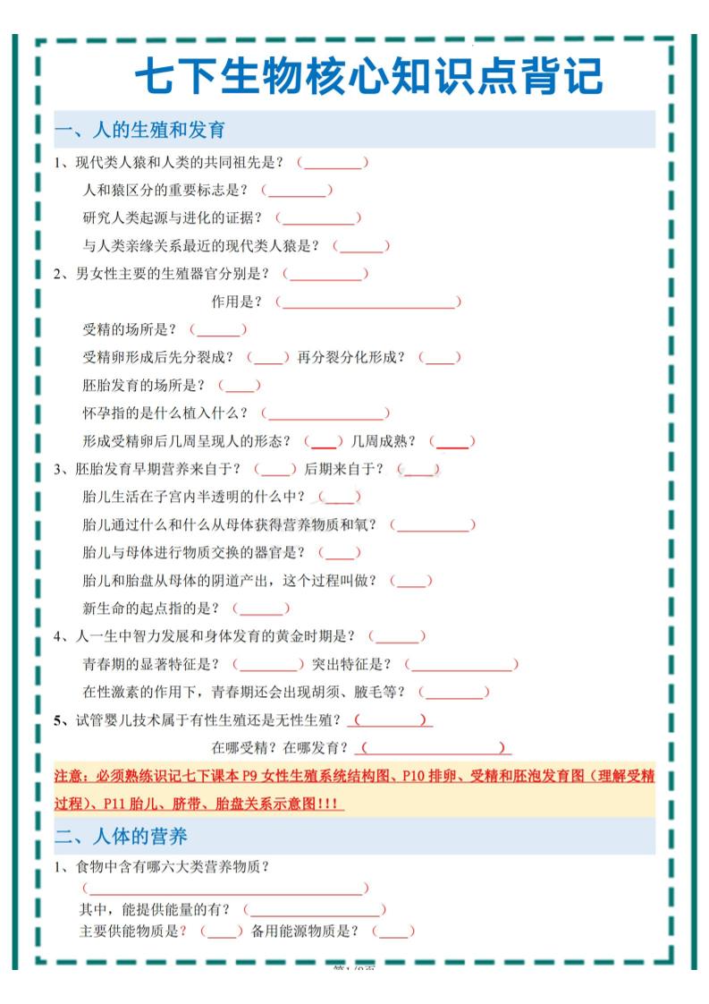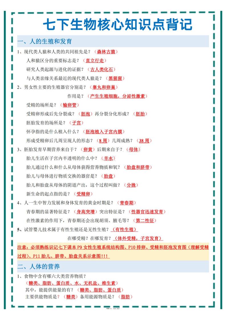 2025年中考生物一轮复习:七下生物核心考点背记提纲(背诵)_