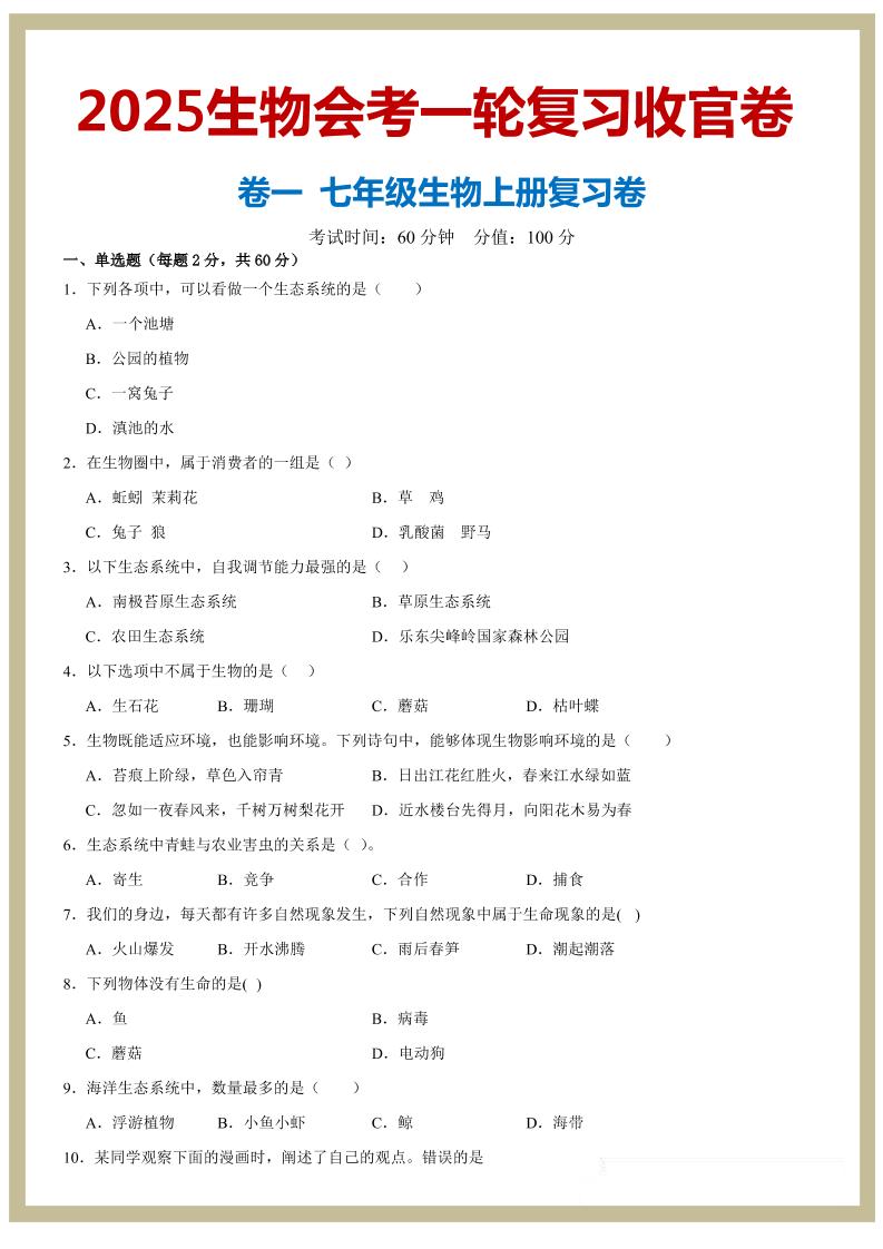 七年级上册--2025生物会考一轮复习收官卷(原卷版)_