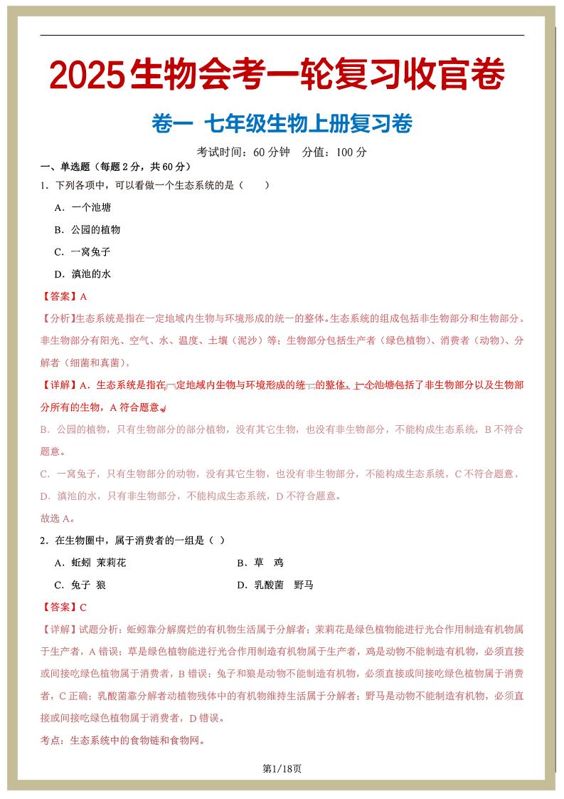 七年级上册--2025生物会考一轮复习收官卷(解析版)_