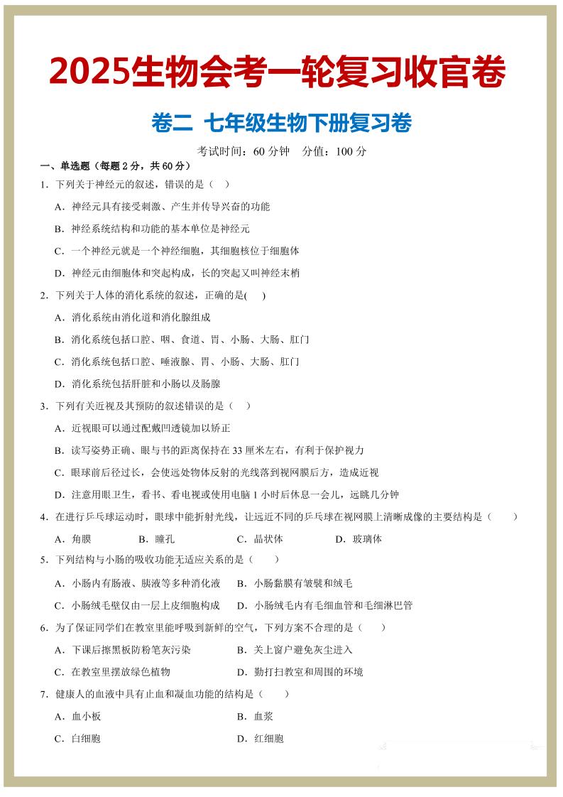 七年级下册--2025生物会考一轮复习收官卷(原卷版)_