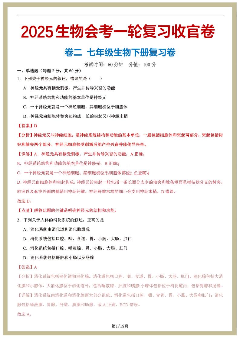 七年级下册--2025生物会考一轮复习收官卷(解析版)