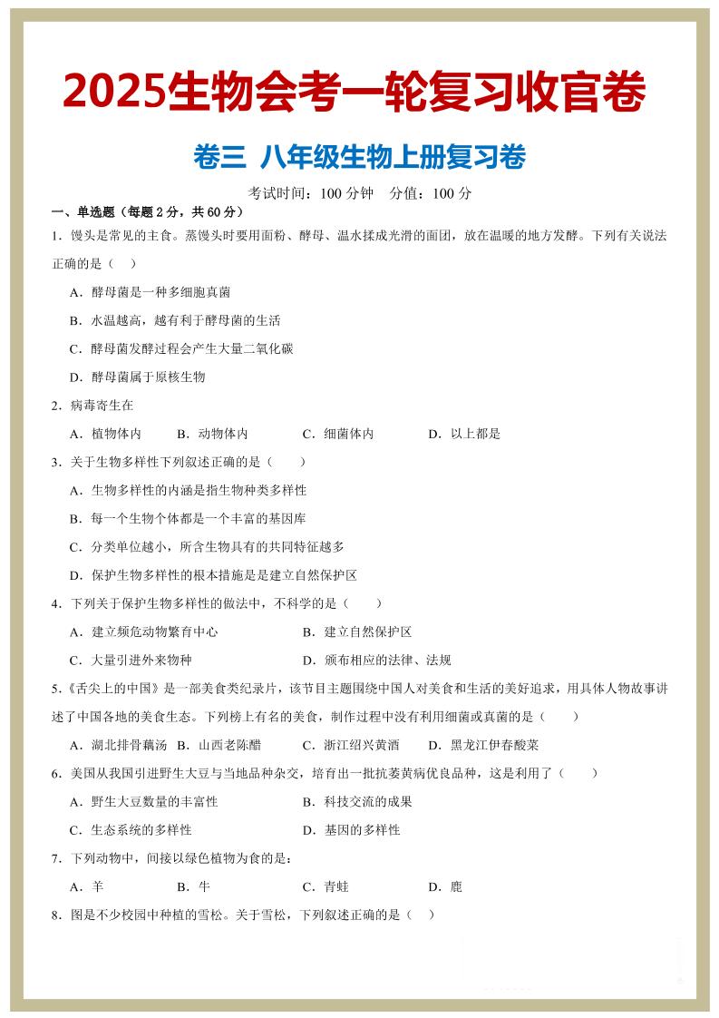 八年级上册--2025生物会考一轮复习收官卷(原卷版)