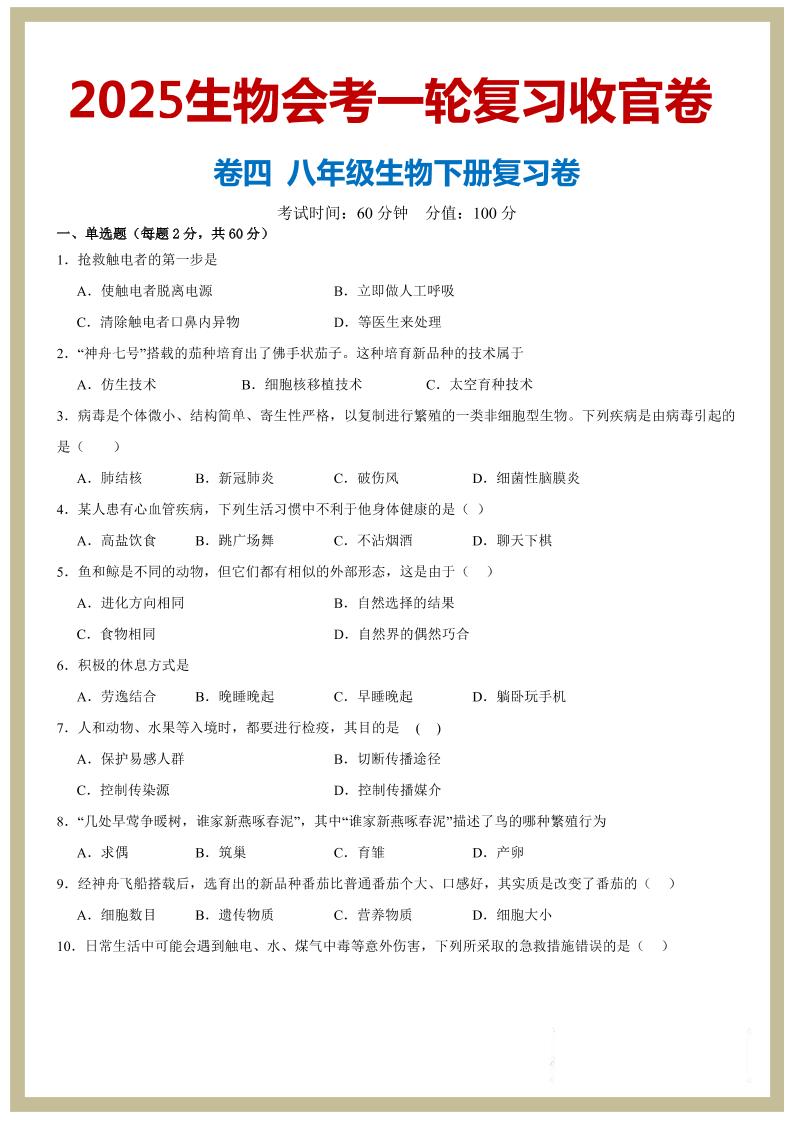 八年级下册--2025生物会考一轮复习收官卷(原卷版)_