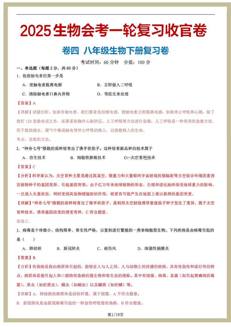 八年级下册--2025生物会考一轮复习收官卷(解析版)