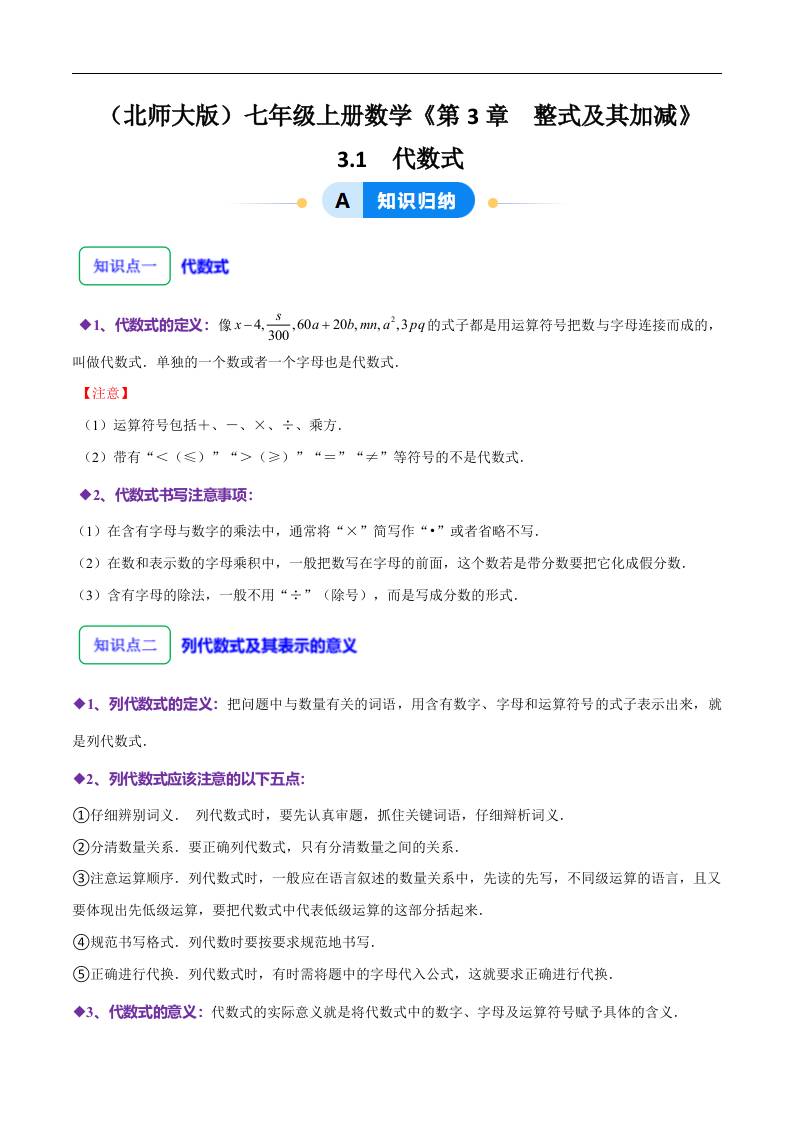 第三章第01讲 代数式(10大题型提分练)(原卷版)