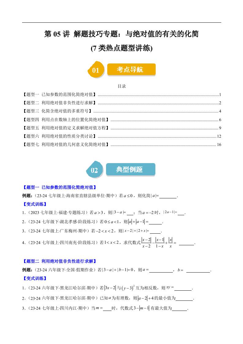 第二章第05讲 解题技巧专题:与绝对值的有关的化简(7类热点题型讲练)(原卷版)