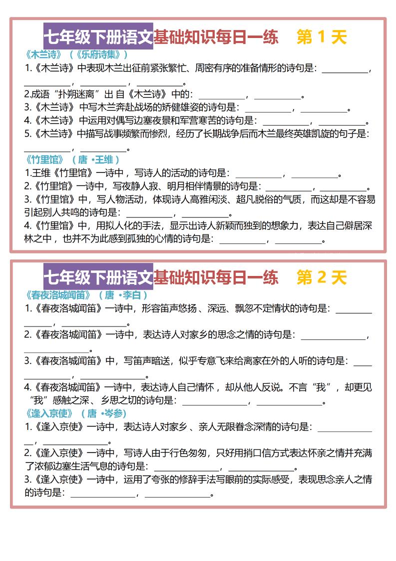 七年级下册语文期末复习每日一练(25天)
