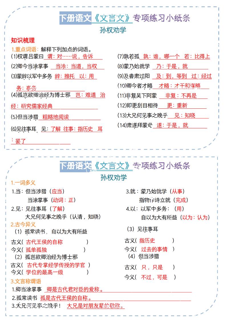 七下语文文言文专项小纸条【答案】