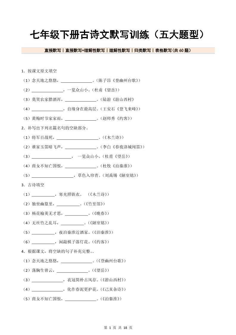 七年级下册语文古诗词默写训练(五大题型)60题(原卷版)