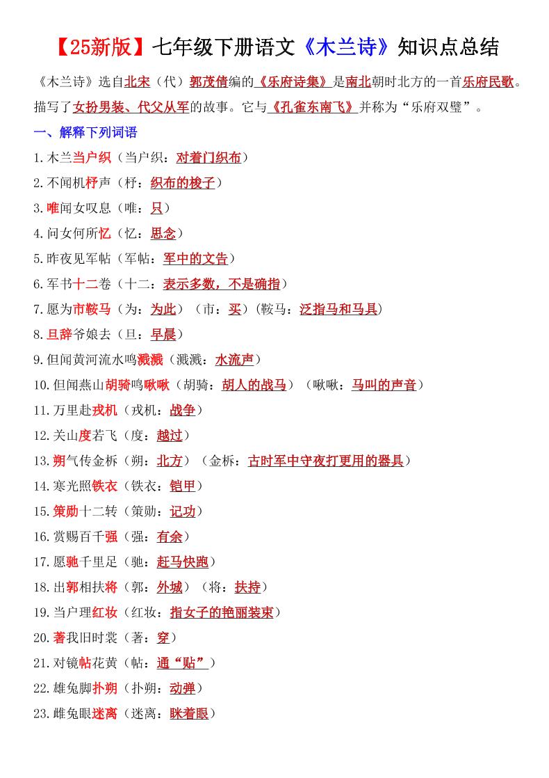 【25新版】七年级下册语文《木兰诗》知识点总结