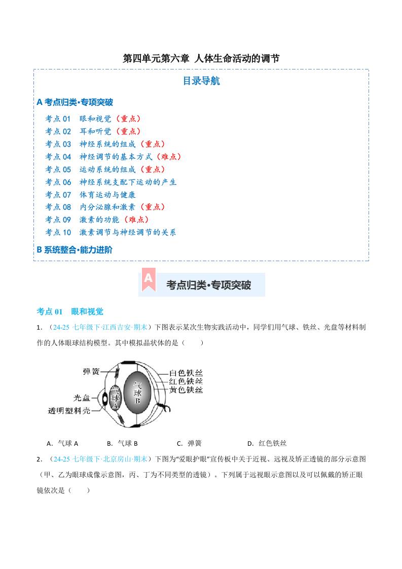 第四单元第六章 人体生命活动的调节(专项训练)(原卷版)