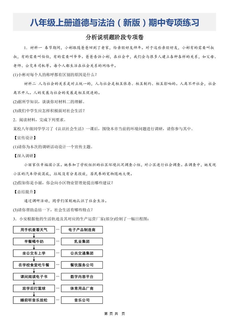 八上道法期中分析说明题阶段专项卷
