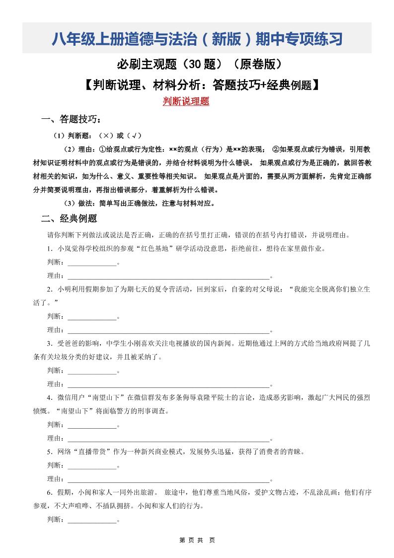 八上道法(期中必刷主观题30题)(原卷版)