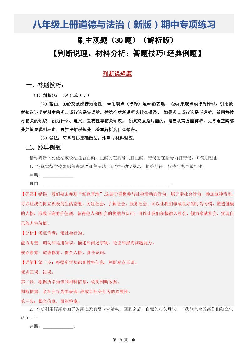 八上道法(期中必刷主观题30题)(解析版)