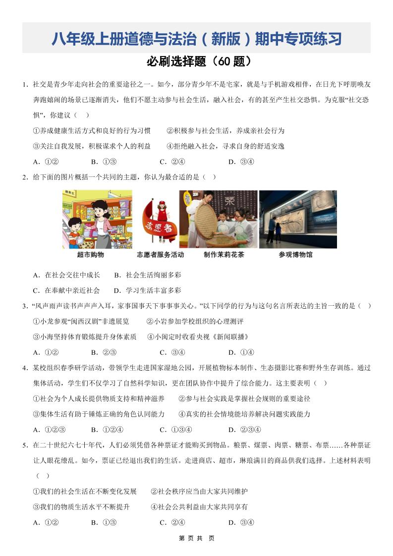 八上道法(期中必刷选择题60题)(原卷版)