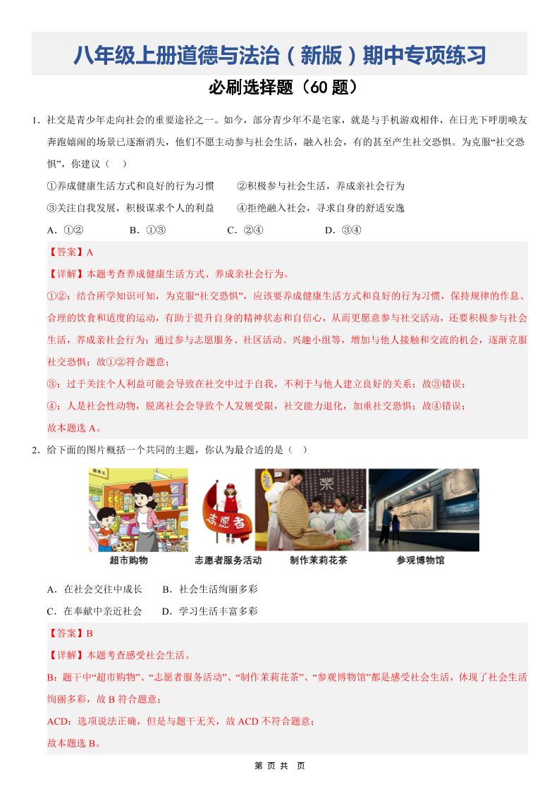 八上道法(期中必刷选择题60题)(解析版)