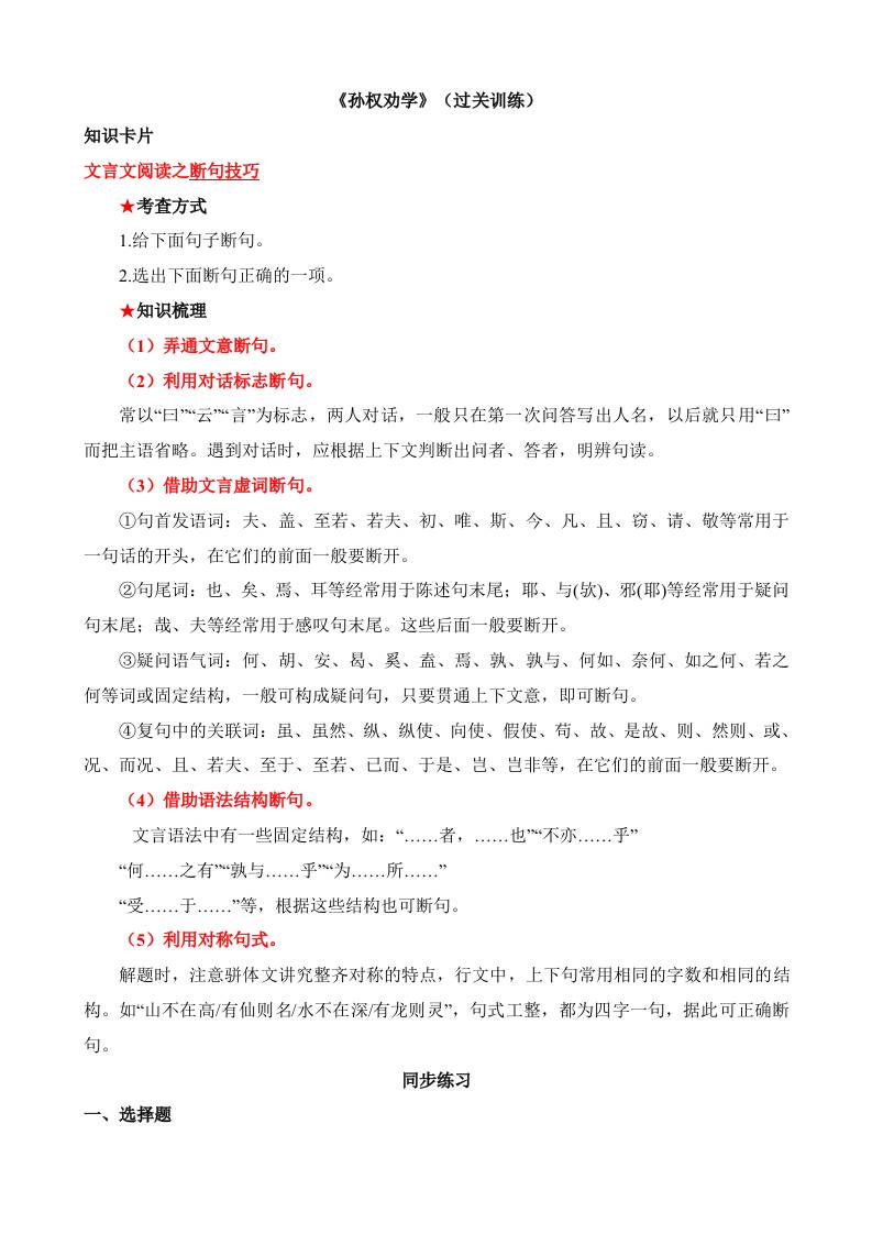 01《孙权劝学》过关训练