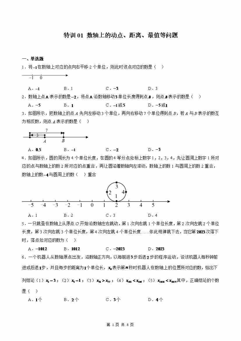 沪教版沪教版特训01:数轴上的动点、距离、最值等问题(原卷版)