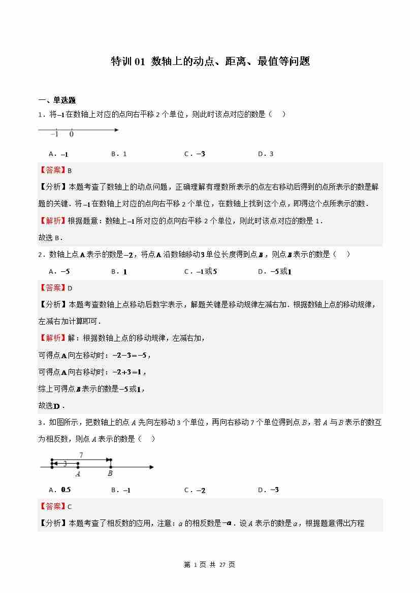 沪教版沪教版特训01:数轴上的动点、距离、最值等问题(解析版)