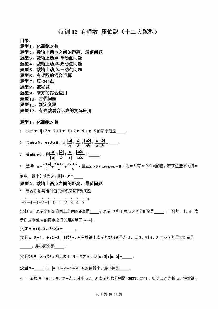沪教版沪教版特训02:有理数压轴题(十二大题型)(原卷版)