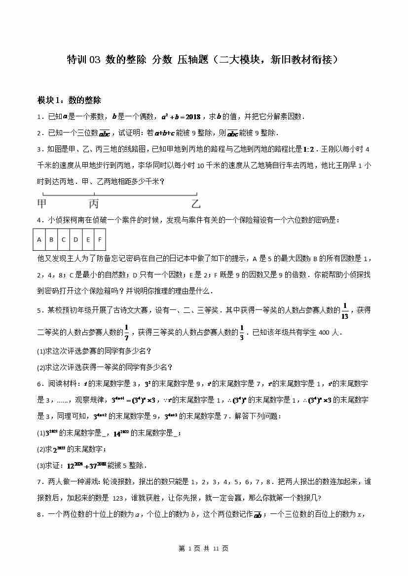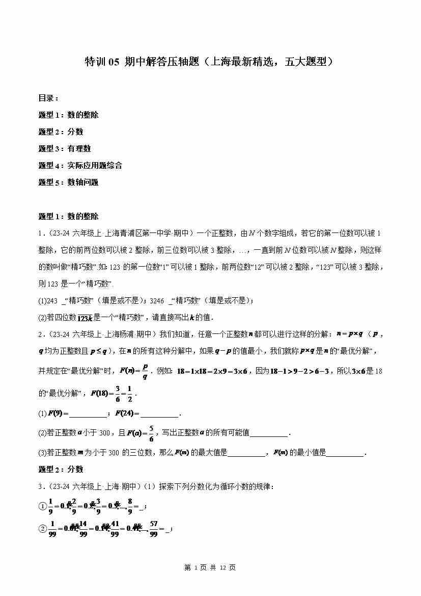沪教版沪教版特训03:数的整除分数压轴题(二大模块,新旧教材衔接)(原卷版)